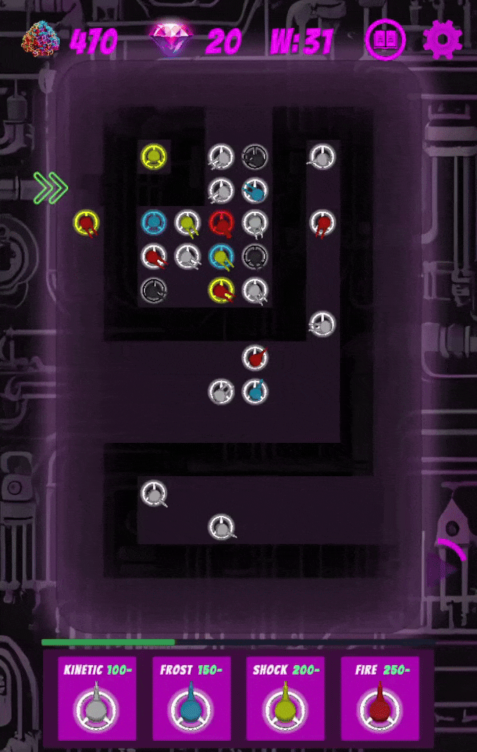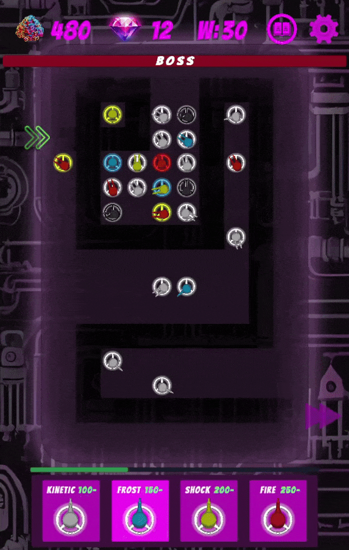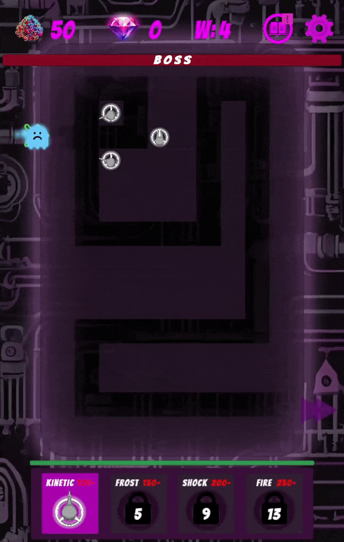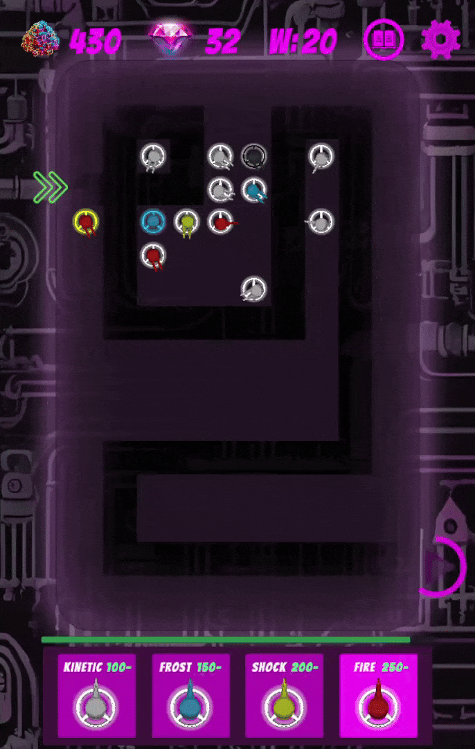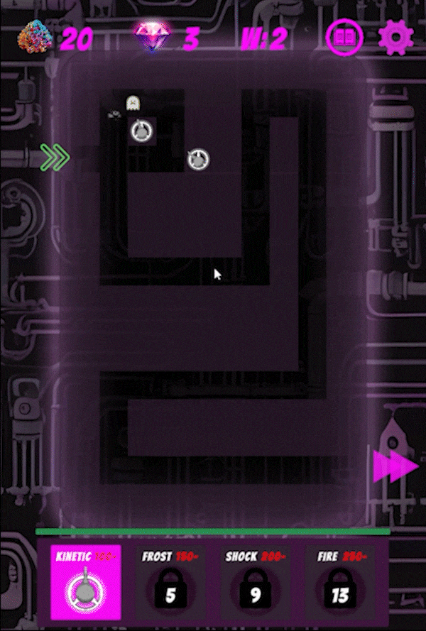 Each base tower: Kinetic, Frost, Shock, and Fire is designed with a clear archetype so players can immediately understand its function and role in the overall strategy. Merges between towers produce hybrid defenses that reinforces tactical creativity, allowing players to adapt to evolving enemy waves and encouraging them to discover synergies organically.